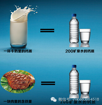 据专家统计,喝一杯牛奶所含的钙质等于200杯矿泉水的含钙量,吃一块肉所含的铁量等于8200杯矿泉水的含铁量。营养专家指出,人体所需要的各种营养素,包括矿物质,微量元素,应该从食物中提取,靠喝水来补充营养,无异于杯水车薪。